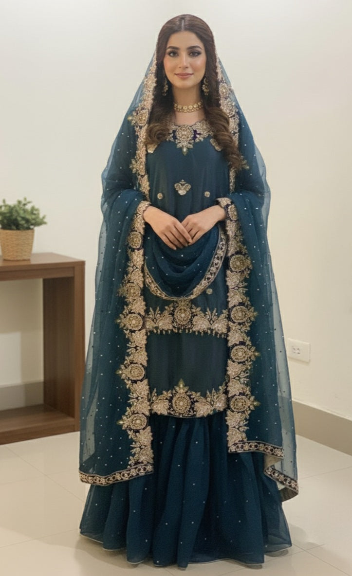 In summary, this is a classic and luxurious Pakistani party wear outfit. The shirt is a stunning example of traditional craftsmanship, featuring heavy gold embroidery on a rich teal base, perfectly designed to be worn for a significant celebration.