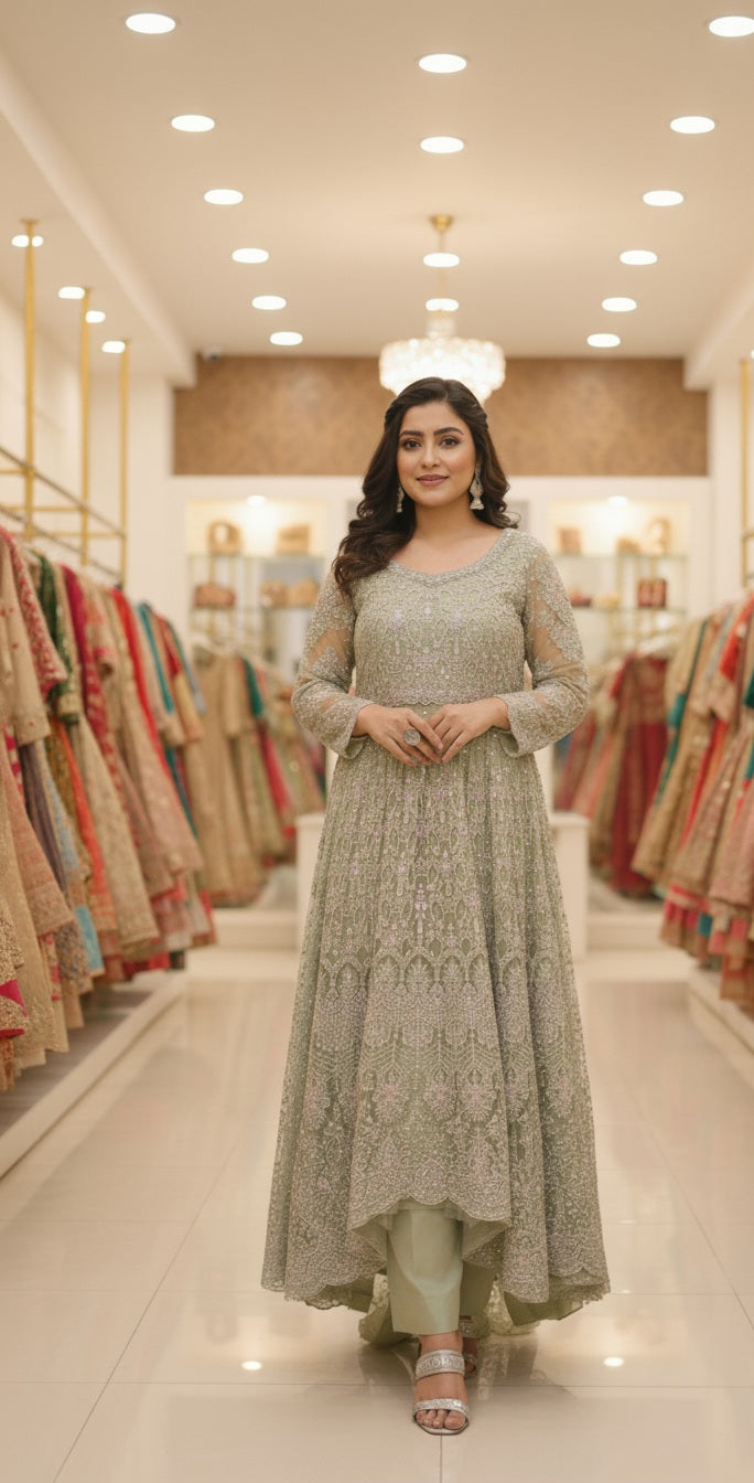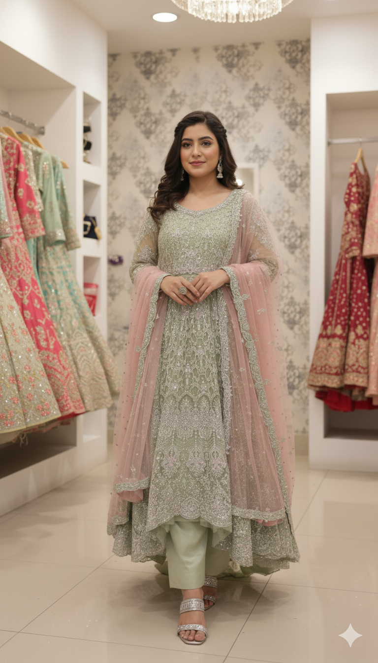 - Sequins (Sitara): Tiny, shimmering sequins are scattered throughout the design, catching the light beautifully.