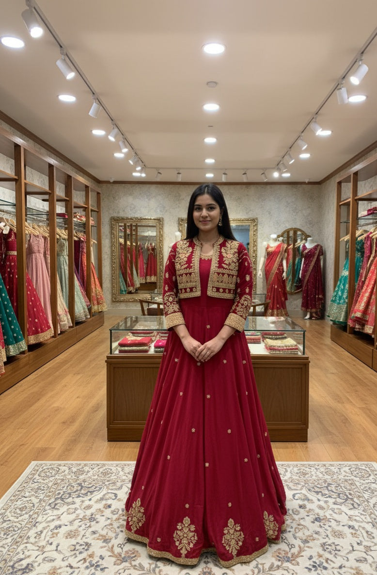 - Design: A stunning two-piece set including a floor-length Anarkali gown and a matching cropped jacket (Koti).